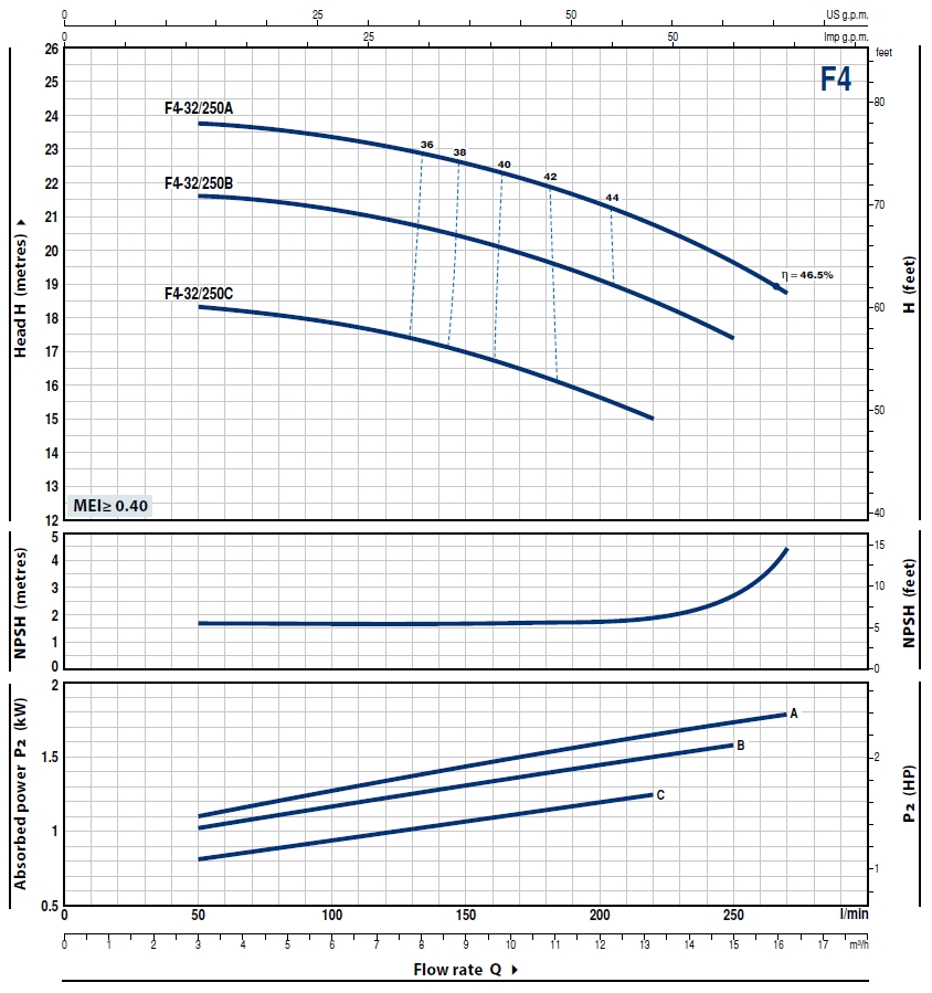 Pompa powierzchniowa Pedrollo F4-32 to urządzenie jednostopniowe, normalnie ssące. Zostało wykonane wg. normy "EN 733" dla pomp odśrodkowych z wlotem osiowym. Silnik pomp mają mniejszą niż standardowa prędkość obrotową równą n=1450 min-1